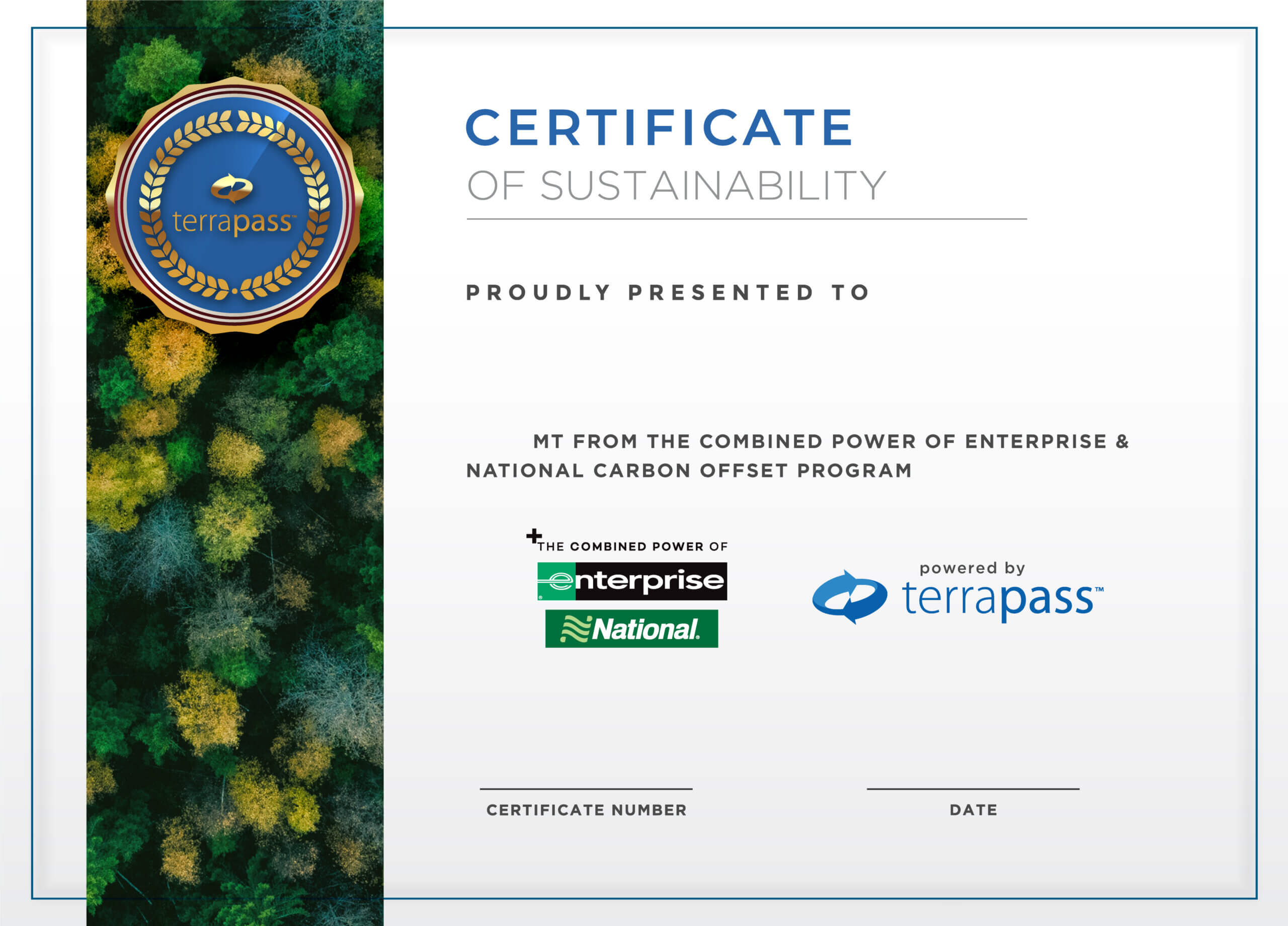 Enterprise and National are committed to helping our customers achieve their business goals. Weโre working with Terrapass to facilitate an easy solution for customers to offset their carbon footprints and fulfill their corporate sustainability objectives.โฏWeโve also negotiated a discounted rate for offsets to provide our customers with additional value.